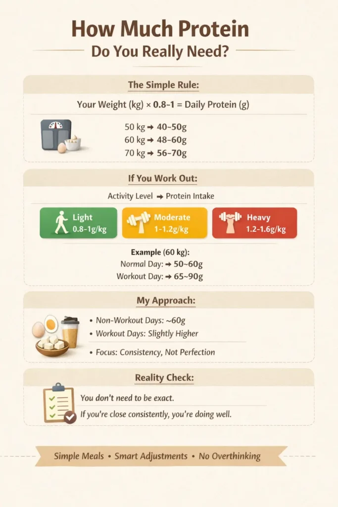 I weigh around 60 kgs, and as someone who eats eggs but not meat, I aim for at least 60 grams of protein daily—roughly equal to my body weight. On days I work out or feel particularly drained, I increase that intake slightly.
